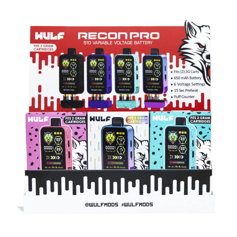 Step up your cartridge vaporizer inventory with the Wulf Mods Recon Pro Dual 510 Voltage Battery. The Recon Pro Dual earns its name thanks to its 2 separate 510 threaded connections, both able to handle cartridges up to 2G in size (4G total), for the ultimate blended vapor experience. Underneath the hood, the Recon Pro Dual has a 650mAh battery, fully concealed cartridge ports, an expanded choice of 6 voltage settings (1.8, 2.2, 2.7, 3.2, 3.7,4.2v), and fiery 15s preheat function with choice of two different settings (1.8 and 3.2v).